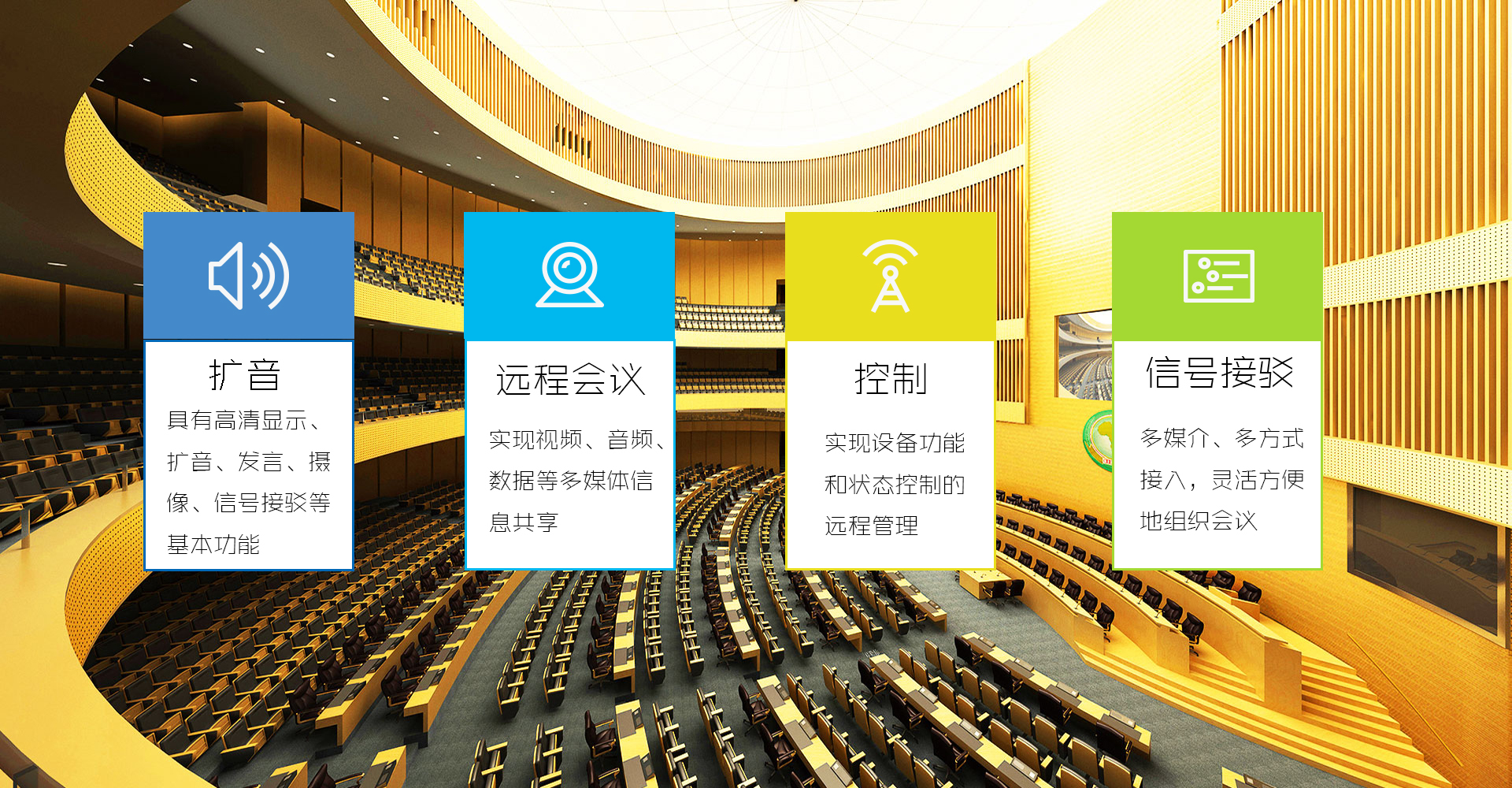 智能化會議系統(tǒng)具有高清顯示、擴音、發(fā)言、攝像、信號接駁等基本功能,同時也應具備智能化管理功能;實現(xiàn)視頻、音頻、數(shù)據(jù)等多媒體信息共享;實現(xiàn)設備控制和狀態(tài)的安全遠程管理;具有會議預訂、變更、查詢、錄播、權限設置等會議管理功能;具有應急響應功能;可實現(xiàn)在會議中的無縫切換,保障會議平穩(wěn)進行;多媒介,多方式接入,靈活方便地組織會議。